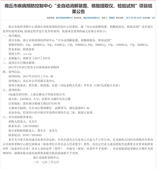上海樂捷中標商丘市疾病預防控制中心“全自動消解裝置、核酸提取儀、檢驗試劑”項目